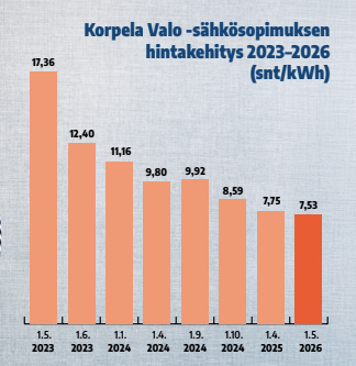 Korpela Valo -sähkösopimuksen hintakehitys vuosina 2023-2026 (snt/kWh)