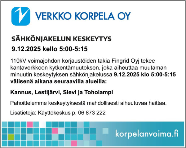 110 kV voimajohdon korjaustöiden takia Fingrid Oyj tekee kantaverkkoon kytkentämuutoksen, joka aiheuttaa muutaman minuutin keskeytyksen sähkönjakelussa ti 9.12.2025 kello 5:00-5:15 seuraavilla alueilla: